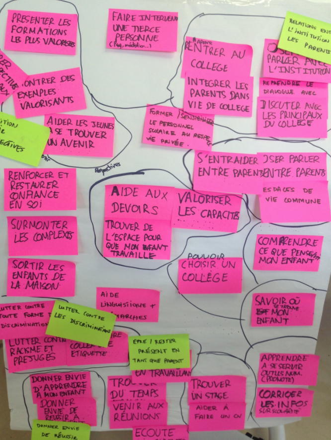 “ Le collège n’apprend pas comment aider les parents, ils ont besoin d’être soutenus.”“ Je n’ai pas été préparé à la transition entre école primaire et collège. En particulier les relation avec le personnel éducatif.” Comment former et aider à utiliser les logiciels de suivi de scolarité“ Beaucoup de parents ne savent pas se servir d’internet, et éprouvent beaucoup de difficultés à utiliser Pronote, le logiciel qui intègre les notes, les absences, et permet de dialoguer avec l’administration éducative. Ils se sentent exclus.” Discrimination, inégalités, démotivation“ Le problème c’est que les enfants sont rabaissés. On ne les met pas en avant dans le 18e.”“ Ils n’ont plus envie. Ils pensent qu’il n’ont pas d’avenir. Mon enfant de 10 ans me dit que parce qu’il est noir, les autres ne veulent pas jouer avec lui.”“ Il faut donner envie de réussir.” “ Le problème, c’est quel exemple ont leur donne”“ Les lycées qu’on propose à nos enfants après la 3è sont uniquement des lycées professionnels et jamais de lycées généraux. Les métiers scientifiques ont leur dit que ce n’ait pas fait pour eux. Parce qu’ils habitent porte de la Chapelle… C’est horrible.” Harcèlement“ Mon enfant a vécu une histoire de harcèlement. Le fait que la prof l’ai repéré ca a aidé. Des fois ils faut vraiment l’aide d’une tierce personne. La situation s’est calmée grâce à la bienveillance de la professeure.”