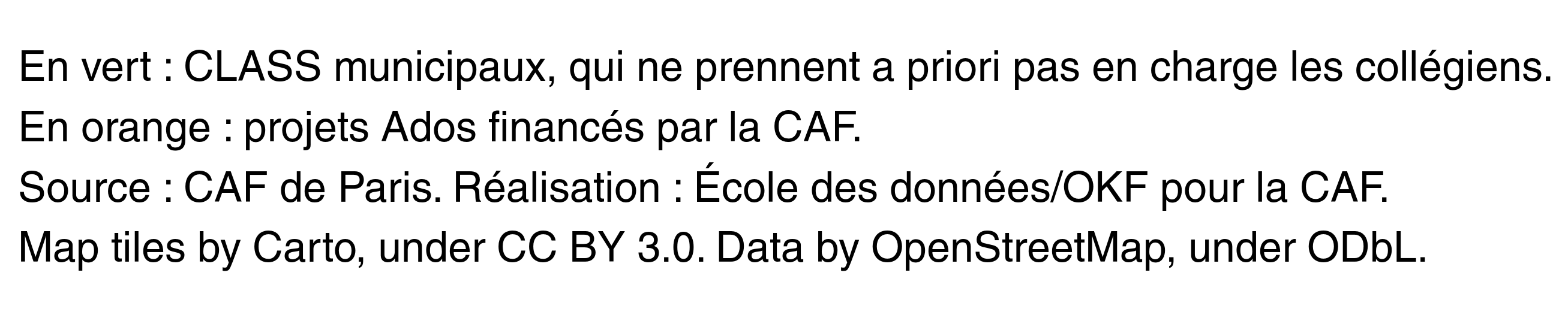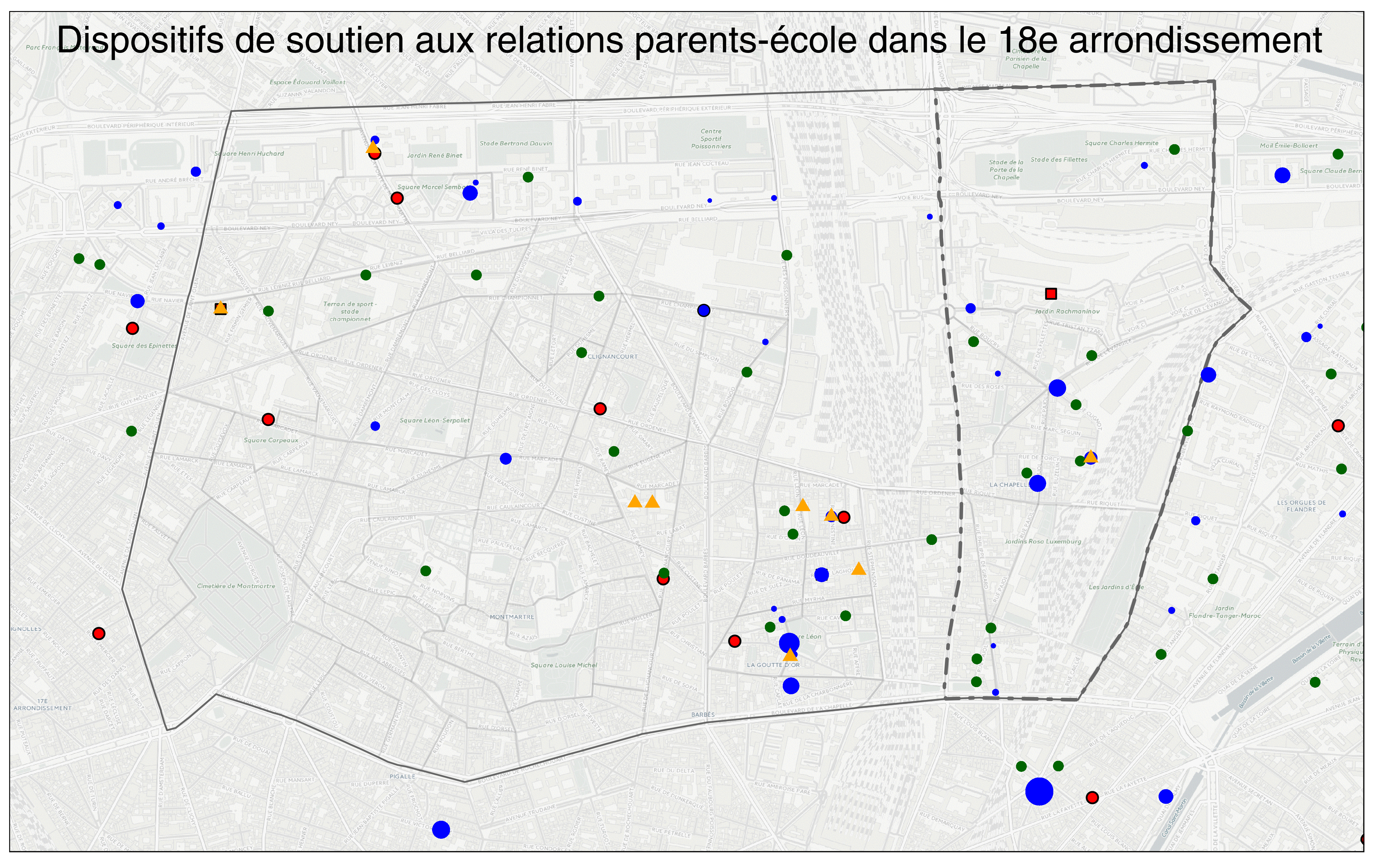 20 Le nombre d’initiatives financées par la Caf recensées dans le quartier Repérer l’offre d’accompagnement existante aux relations avec le collège et à la vie au collège dans le 18ème arrondissement était un des objectifs annoncés pour cette expédition de données. Une carte de ces lieux a été préparée et imprimée ( source des données : CAF, lieux de médiation et familiale et REAAP)