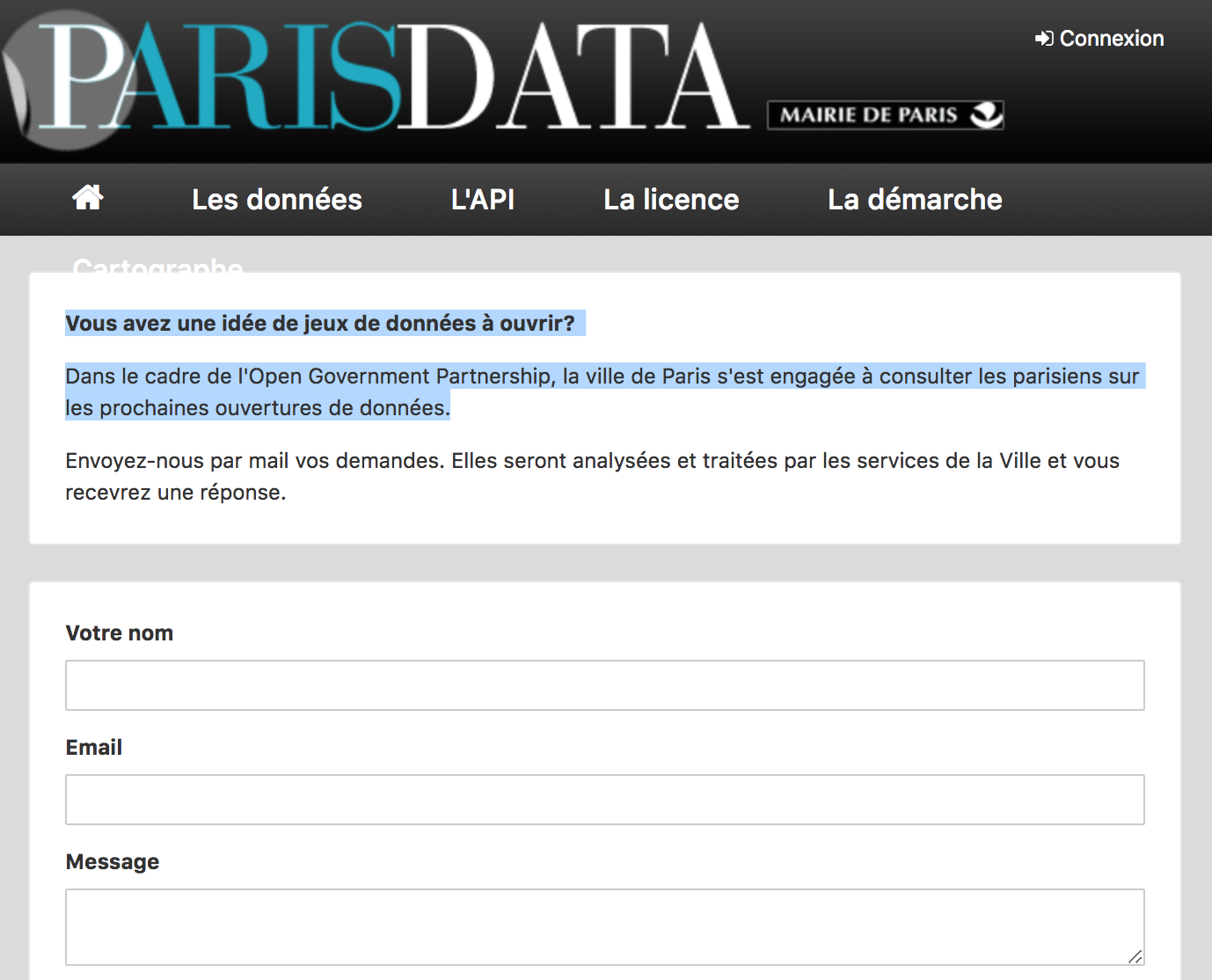 - Le formulaire sur le portail Open Data : https://opendata.paris.fr/pages/contact/
