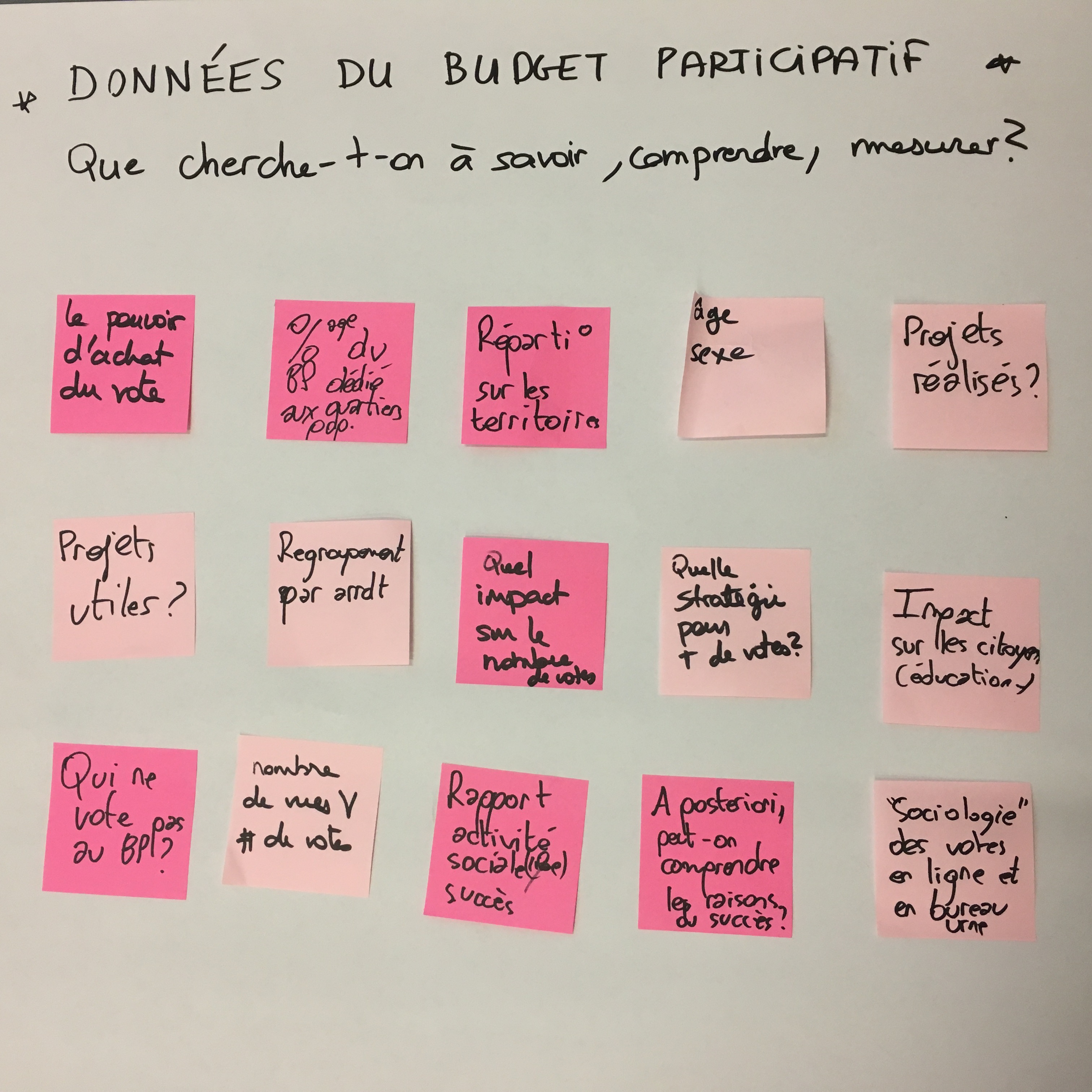 La première étape consiste donc à définir ce que l’on cherche dans les données. Nous avons donc posé la question “Que cherche-t-on à savoir, à comprendre, à mesurer ?” aux participant.e.s et avons noté les réponses sur des posts-its au fur et à mesure qu’elles étaient exprimées.